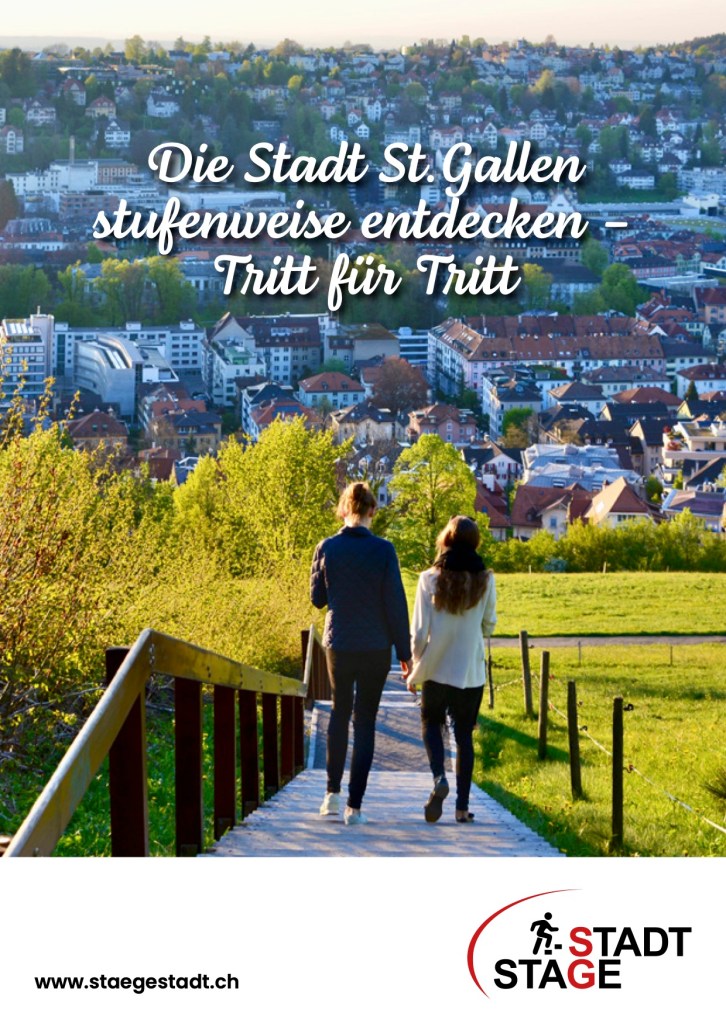 Zusammen mit St.Gallen-Bodensee Tourismus haben wir die 30-seitige Broschüre «Die Stadt St.Gallen stufenweise entdecken – Tritt für Tritt» verfasst, die viel Wissenswertes zu den St.Gallern Treppen präsentiert und in der mehrere St.Galler Persönlichkeiten ihre eigene Beziehung zu ihnen beschreiben. Zudem gibt es unter anderem Argumente fürs Treppensteigen, Trainingsideen und Tipps für ganz unterschiedliche Treppentouren (inkl. QR-Codes), die Fotos stammen von unserem Projektgruppenmitglied Klaus Stadler. Die Broschüre kann hier heruntergeladen und bei der Tourist Information an der Bankgasse 9 in St.Gallen kostenlos in Hosentaschengrösse bezogen werden.