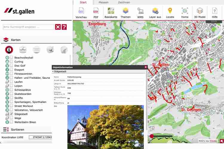 Zusammen mit der Stadtverwaltung unterhalten wir die hier verlinkte, mit Informationen und hochauflösenden Fotos angereicherte Stägestadt-Karte (im Bild der Falkenburgweg als längste Stadttreppe mit 529 Stufen). Via Klick auf die roten Linien sieht man Informationen sowie je ein Foto der gewählten Treppen und kann mit je einem weiteren Klick die gewünschten hochauflösenden Bilder herunterladen. Die Fotos können unter der Angabe des Fotografen Klaus Stadler kostenlos in Medien weiterverwendet werden.